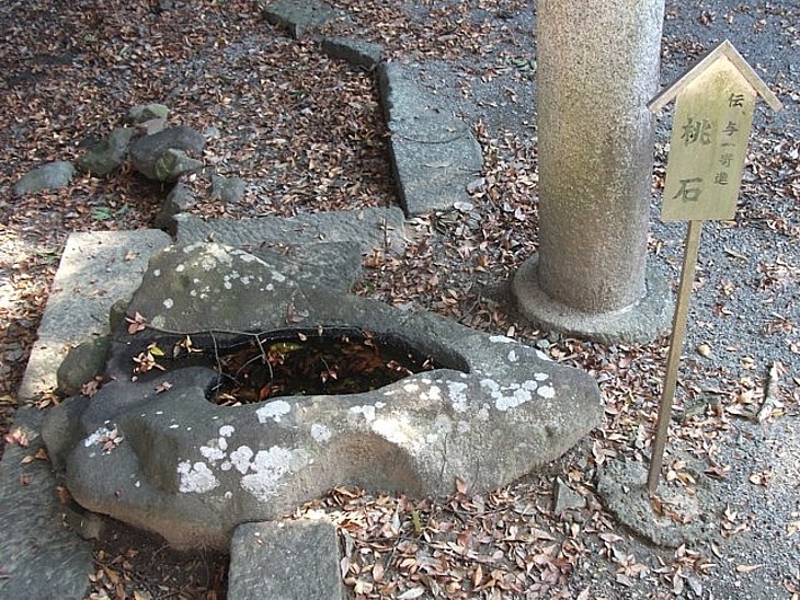 拝殿左手前の、同じく義成寄進の桃石。凹んでいる部分を種の跡に見立てているのかな。