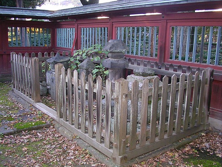 赤御堂裏の源義国の墓所。右手前の台座を失った巨大な笠が義国の五輪塔だろうか。
