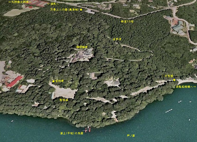 芦ノ湖湖上から見た箱根神社と万巻上人の墓所の鳥瞰