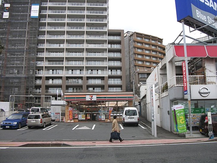 銀座入口を右に進むとすぐ海岸通り。コンビニ裏手の旅館街は全てマンションに変った。