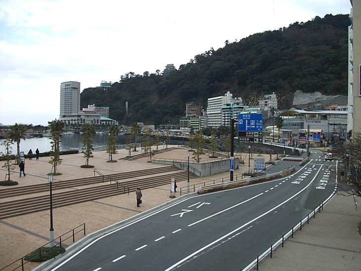反対側の漁港方向。フェリー乗り場から初島や伊東経由大島行きのジェット船が出港する。