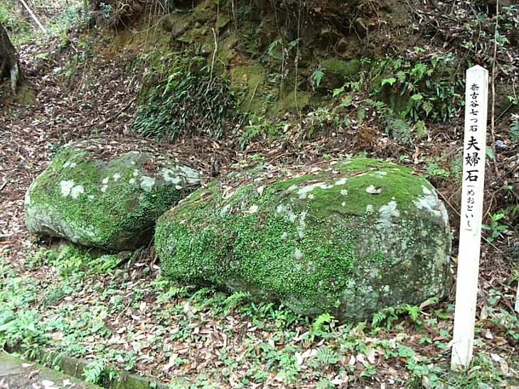 夫婦石。文覚草庵を尋ねた頼朝と政子がこの石に腰掛けたと伝わる。誰の発案だろうね。