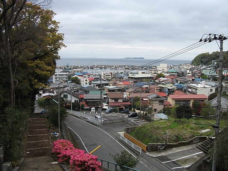 境内の右端から伊東漁港の方向を。中央の大きな屋根が共同湯のある久須美温泉会館。