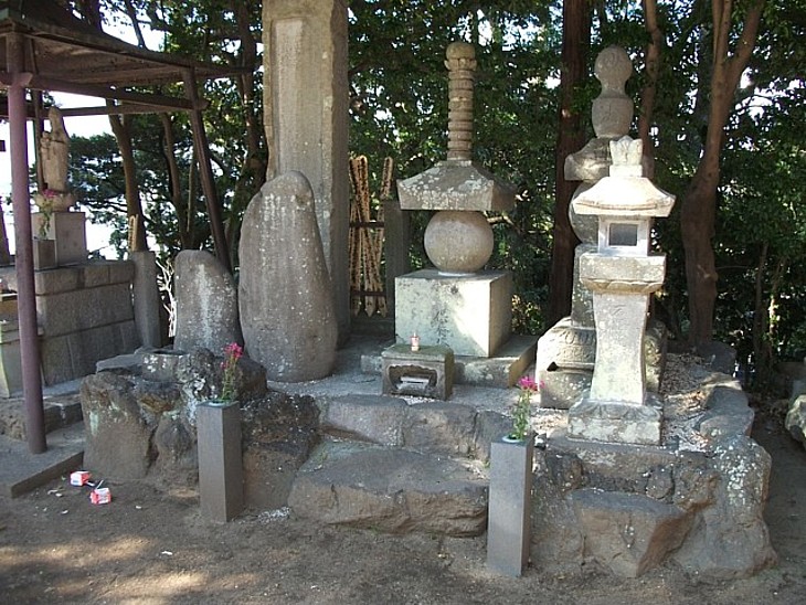 (旧)山門横の五輪塔と石碑は元禄時代と関東大震災の津波被災者を慰霊している。