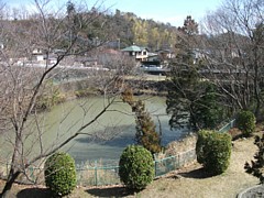 中: 団地中央に近い調整池は左手に小さな公園を併設している。一帯の旧字名が寺洞で池場寺の跡と推定されるが既に遺構は見られない。
