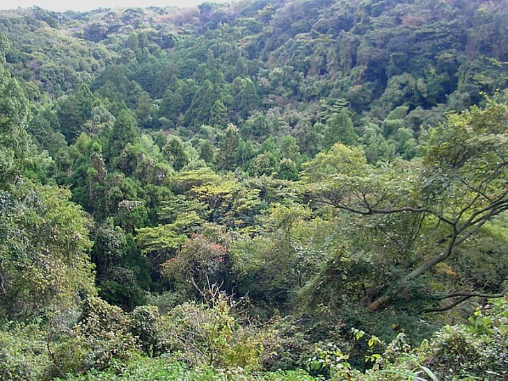 血塚から100mほど上の「椎の木三本」直下の旧道から旧々道の血塚の方向を見る。