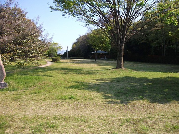 墓所の小道を抜けて空堀の残る芝生広場を撮影。この画像は南側の駐車場寄りから。
