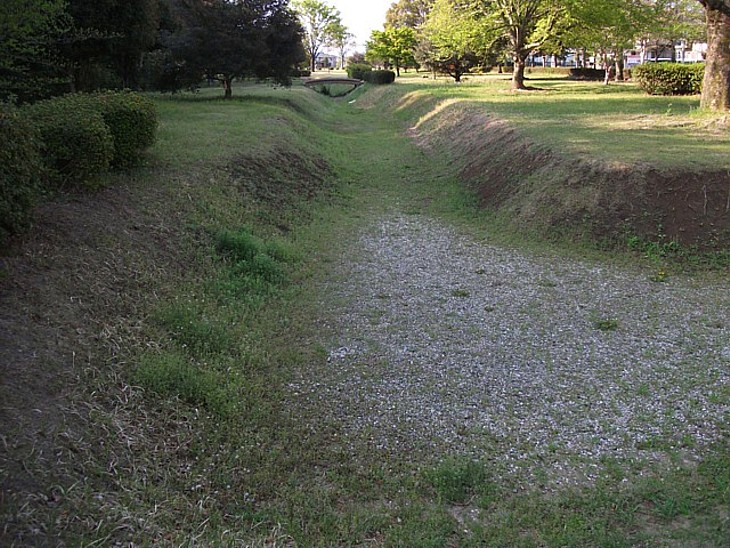 空堀の痕跡が残る芝生広場。この画像は最も北側から南に向って撮影したもの。