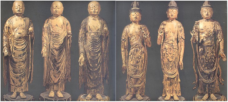 三つの須弥壇の仏像の集合。三代に各々一組づつ造られ、微妙な様式の変化が確認できる。