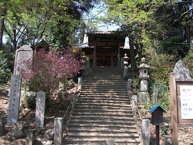 南北に長い前方後円墳の東側から石段を登ると古墳中央の千手観音堂に至る。