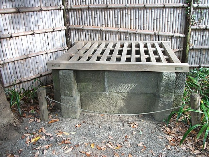 鎌倉石を積んだ首洗い井戸。義経の首は金色の亀の甲羅に乗って流れ着いた、と伝わる。