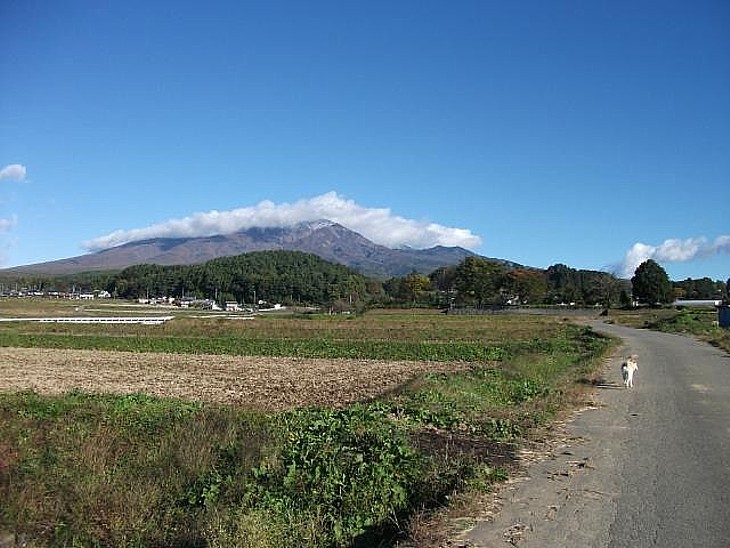 北の八ヶ岳連峰を振り返る。農道の突当りが金生遺跡、右側の高みが谷戸(逸見)城址。