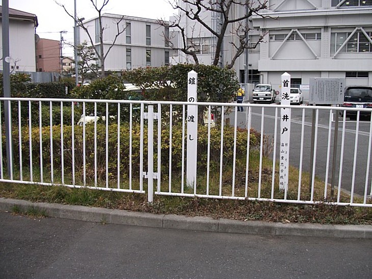 市役所裏手の「首洗い井戸」と「鎧の渡し」標識。河川改修などのため木柱だけになった。