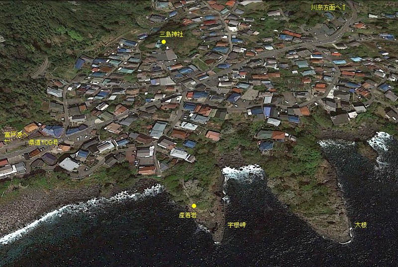 千鶴丸の遺骸が流れ着いたと伝わる富戸の宇根岬。遺骸の衣類を乾かした産着岩が残されている。