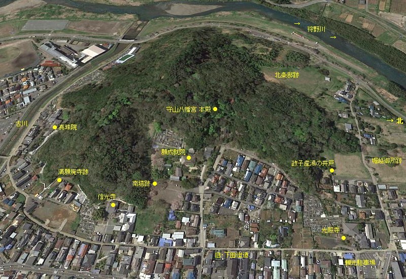 守山の東側上空から。最盛期の願成就院は満願廃寺付近から堀越御所跡付近までを占めていた。