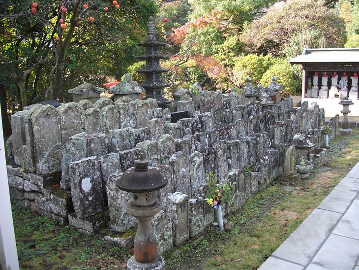 山門横の古い石塔群の裏が時政の墓所。時政以外の北條一族は葬られていない。