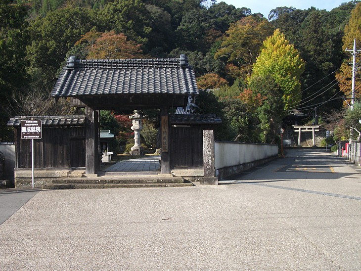願成就院の山門。高野山真言宗で山号は天守君山、右奥に守山八幡の鳥居が見える。