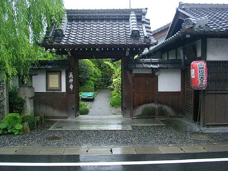 大津膳所の義仲寺山門。寿永三年1月、義仲は粟津ヶ原で石田為久に討ち取られている。