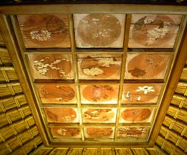 翁堂天井の四季花卉図。現在の画は明治21年に俳人の穂積永機が奉納したもの。