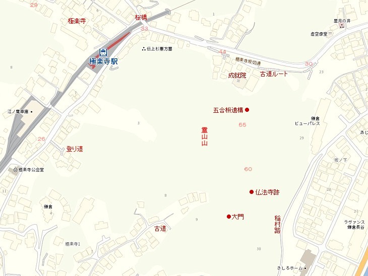 極楽寺坂周辺の拡大地図、赤数字は標高。五合桝は土塁などを備え、死闘を繰り返いた軍事施設の遺構。