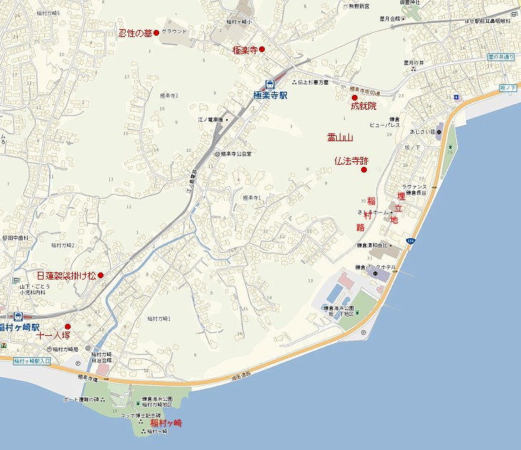 極楽寺坂から稲村ヶ崎周辺までの地図。大舘宗氏が討死した坂ノ下合戦場から十一人塚までは約3km。