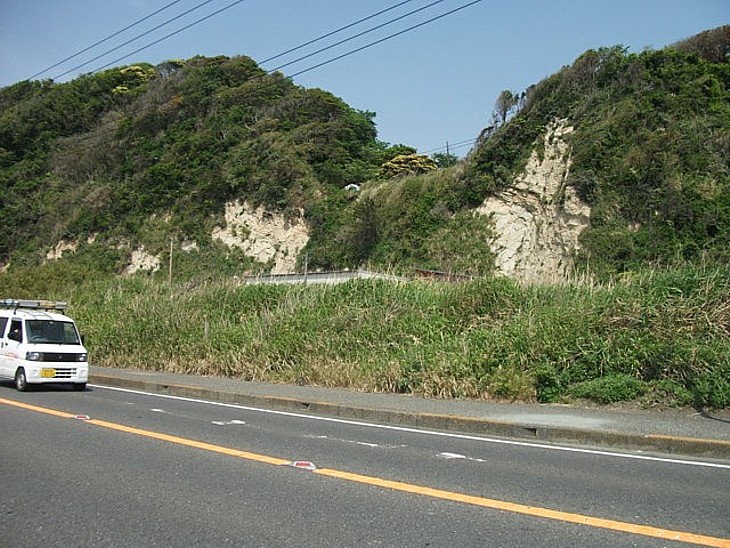 稲村ヶ崎から国道を歩いて最初に見える崖の鞍部。稲村路は画像付近から波打ち際に下っていたのかも。