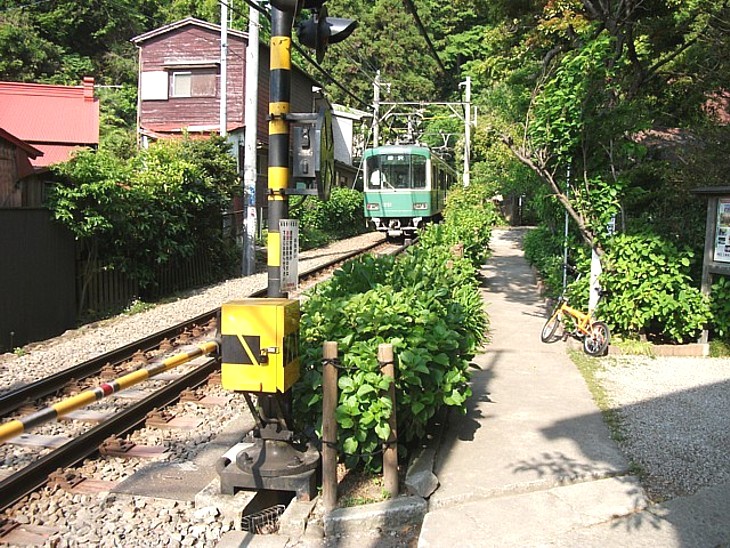 権五郎神社に向うと左側、江ノ電唯一の極楽寺トンネルを抜けた鎌倉駅行きの電車が近付いてくる。