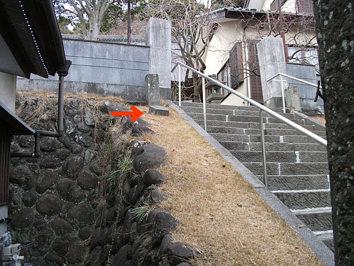 石段の上から三段目、津波の到達点をマークした石。海面からの高さは7mを越える。