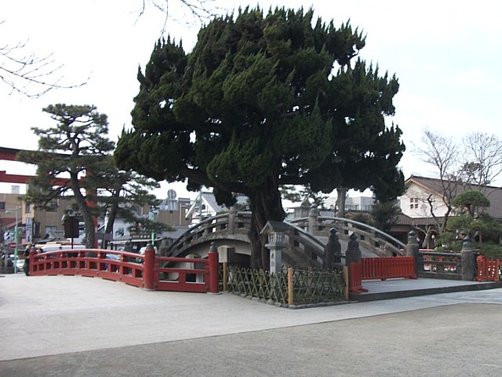 境内から太鼓橋(赤橋)を経て三の鳥居方向を。左右の参道を進む参拝者を美しいビャクシンが迎える。