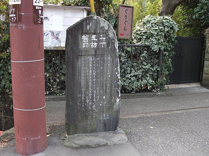 八幡宮の北側、供僧が住んだ二十五坊旧蹟の入口。道路沿いに青年団の石碑が建つ。