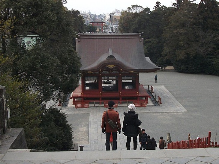 本宮の前から舞殿を。八幡宮境内の中で唯一、若宮大路の段葛まで展望できる場所だ。