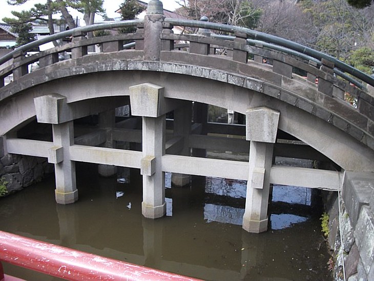 建造当初は赤橋と呼ばれる朱塗りの木橋だった。本殿に向って左が平家池、右が源氏池。