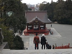 右: 舞殿の横から大石段を経て本殿(上宮)を。創建当初は舞殿の場所が本殿(鶴岡若宮)で、現在の石段と本殿の一帯は只の裏山だった。