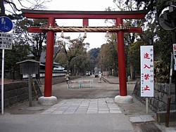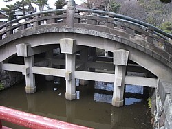 構えて「赤橋」を名乗った、と伝わる。現在は通行禁止で、参拝客は石橋の左右を迂回して舞殿の方向へ進む。