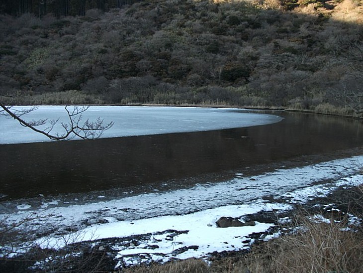 前日まで雪だった1月9日、精進池の岸辺は薄氷で全面氷結はしていないが、沖の氷は広がっている。