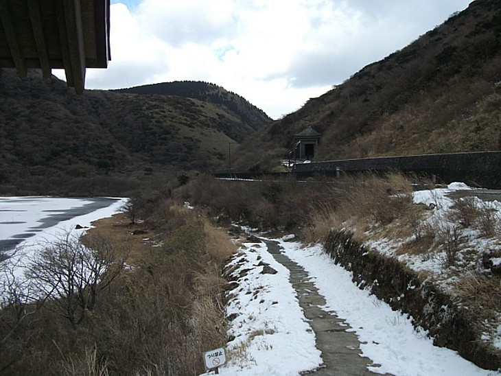 精進池と国道に挟まれ凍結した遊歩道が続く。右上に石仏群の中心・地蔵堂が見える。