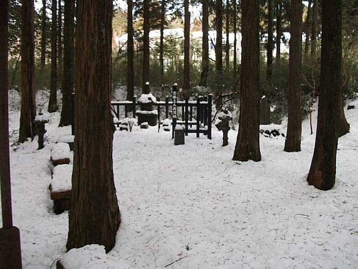 鉄柵が囲む廟所。静謐な一角だが裏手には湖尻に続く県道が通り、リゾートホテルが並ぶ。