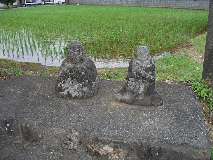白山神社近くの塞の神。隣接地区の子供が取り合ったため2体ある。右の像は合掌、左の像は笏を持つ。
