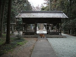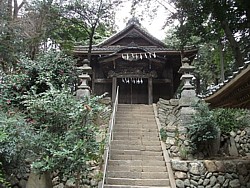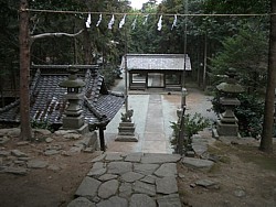 左: 鳥居と本殿の中間にあるのは舞殿を兼ねた神門だろうか、見慣れない配置である。左側の鳥居は石段手前の境内社に続いている。