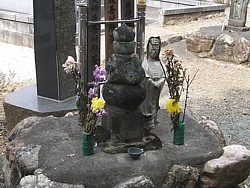 上: 墓地の一角、歴代住職の墓石に囲まれて山吹の墓と伝わる五輪塔が建っている。現代風な観音菩薩や豪勢な御影石の柱は場違いな雰囲気だが、