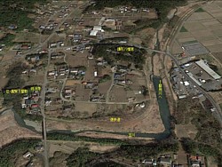 左: 南側から見た鎌形一帯。90度に蛇行する都幾川の左岸に沿ってAとBに班渓寺と義賢下屋敷跡、下流の@に鎌形八幡宮の森がある。