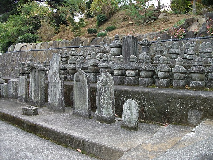 境内横の千人塚。覚淵の墓もあるというが、散乱した石塔を集めて復旧したのだろう。