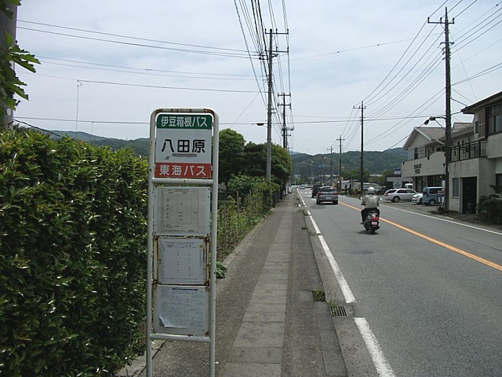 修善寺街道沿いの八田原バス停。大見領の城地区と狩野荘との境界に位置する。
