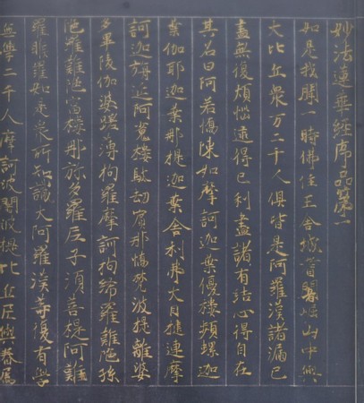 紺紙金字法華経 書き出しの一行は平清盛、以下は平頼盛。巻によって行数は異なる。(クリック→ 拡大表示)