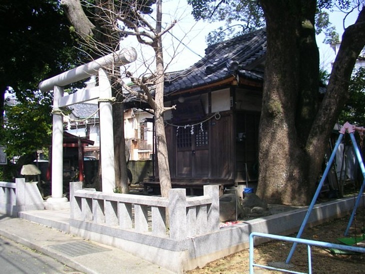 遊具を備えた狭い公園を併設した無住の神社。松川から50mほどの住宅密集地に建つ。