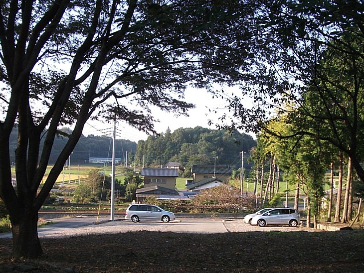 山門の近くから県道方向を撮影。丘陵と平地が適当に混在して穏やかな風景を演出する。