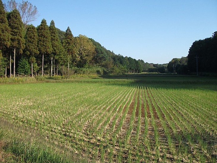 比企尼山の右端側。水田の奥が串引沼、右の山裾沿いに一車線の農道が延びている。