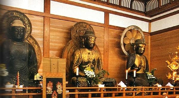 左から 旧閼伽堂にあった薬師如来像265cm、中尊寺本尊の阿弥陀如来坐像268cm、