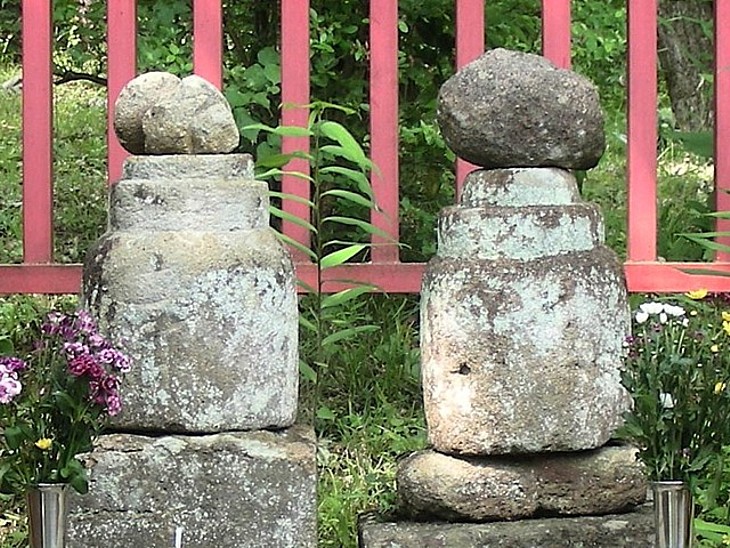 墓石の拡大画像。本当に妻子の墓なのかは不明、頭頂部の石は後世に載せたものだろう。