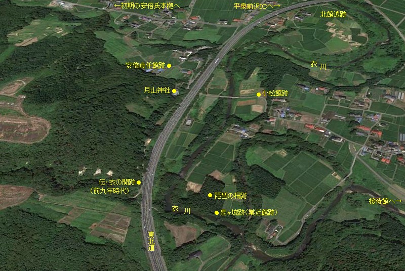 衣の関比定地と貞任館周辺の鳥瞰図。蛇行する衣川と支流が天然の要害を形成する。